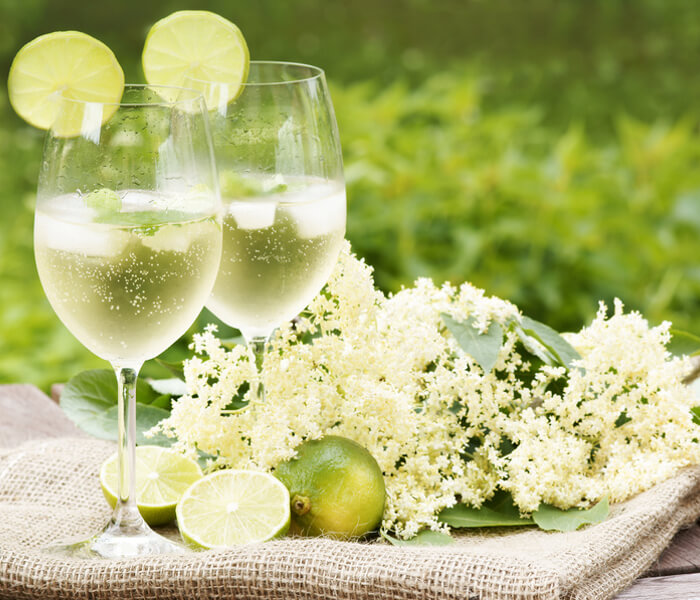 Eine Limettenscheibe und Eiswürfel dazu. Dann mit Prosecco, Mineralwasser und Holunderblütensirup auffüllen.